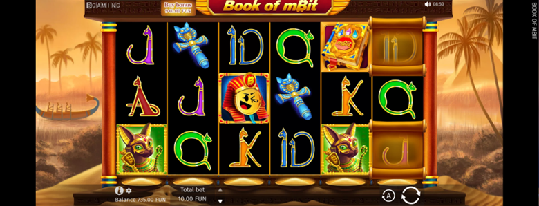 The first game from our list is Book of mBit, a 6×3 with 10 paylines where Mr. Bitty can show up in his Egyptian attire. The game has an Expanding Winline feature – the 6th reel is locked except the middle cell. When a winning combination triggers, you’ll get the same symbol in the middle cell of the 6th reel and the symbol will expand to cover 3 positions on the 6th reel, creating the opportunity for an awesome win.